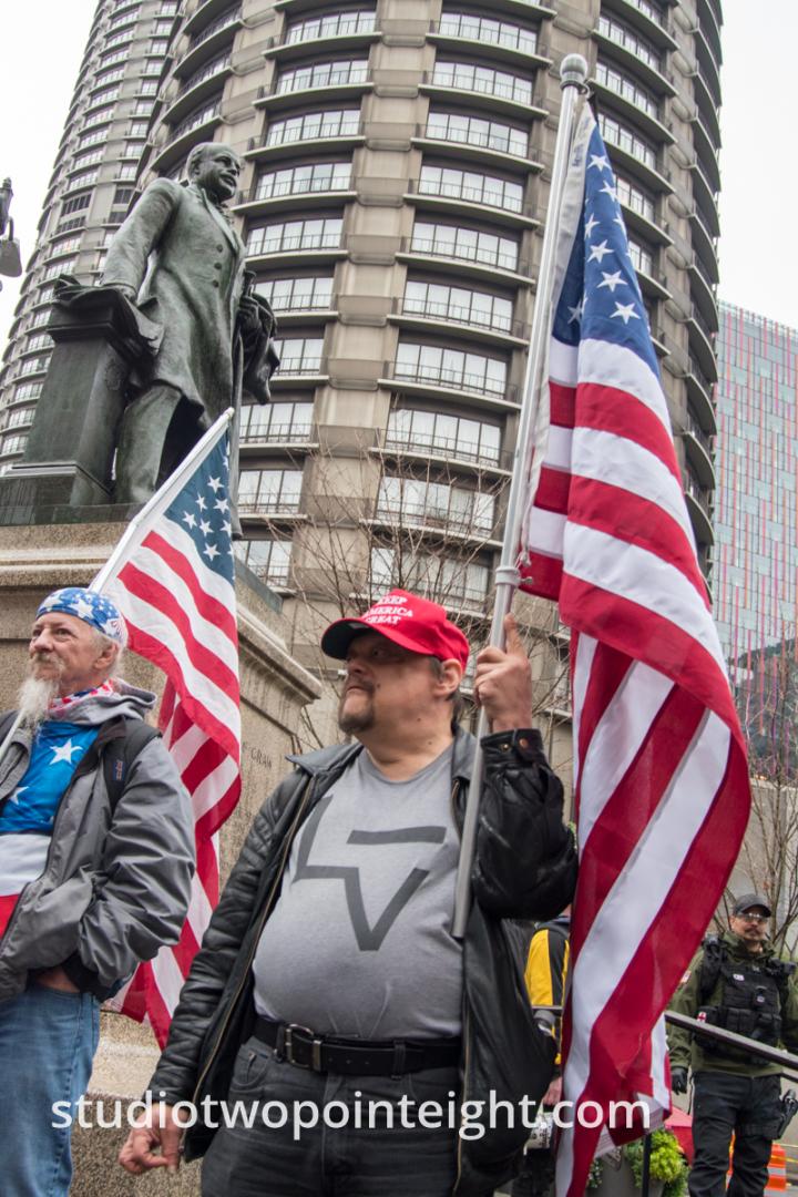 In this Studio 2.8 photography photo, and accompanying video, produced on Saturday December 7, 2019, during a Pearl Harbor Day commemoration event at Seattle's McGraw Square, one of the political Republicans in attendance that day, spoke to some of the anarcho-communist counter-protesters, who were standing in the front of the Bank of America branch building adjacent to the square. The speaker in this Studio 2.8 photograph held a large amplified bullhorn in front of himself, aimed at the counter-protesters.