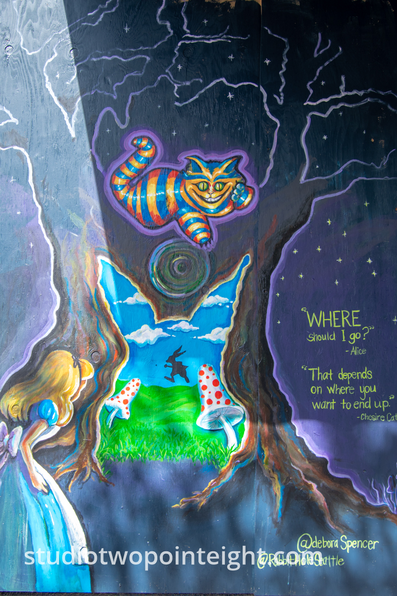 In this Studio 2.8 2020 virus pandemic documentary photograph of the artwork on the plywood that covers the boarded up windows at the Rabbit Hole bar, in Seattle's Belltown neighborhood, the character Alice from the classic book Alice in Wonderland asks the character the Cheshire Cat, "Where should I go", to which the Cheshire Cat replies, "That depends on where you want to end up". Located at 2222 Second Avenue in the Belltown neighborhood of Seattle, it isn't apparent if and/or when businesses such as the Rabbit Hole will re-open or might return to their previous manner of doing business.