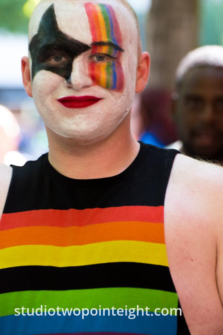 A few sneak peak photographs are already available on the Studio 2.8 www.studiotwopointeight.com photography website, including a photograph of a man with his face painted in a harlequin style who wore a pride flag like rainbow colored tank top shirt.