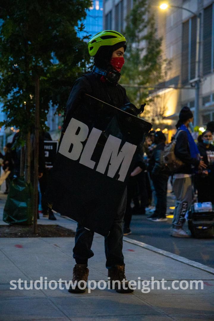 This Studio 2.8 photography photograph was produced on Thursday July 2, 2020, at dusk, on the sidewalk in front of the Seattle Police West Precinct building in Seattle,Washington on Virginia Street between 8th Avenue and 9th Avenue. In this Studio 2.8 photography photo, an apparently European American female Black Lives Matter demonstrator, who wore a bright green bicycle helmet and a red bandanna, held a large rectangular battle shield in front of her that was emblazoned with the acronym BLM on it.