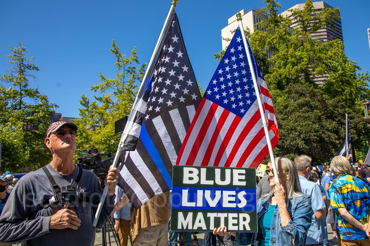 The Studio 2.8 photography super gallery of photographs above presents selected photographs from photos produced by Studio 2.8 Photography on Sunday August 9, 2020 in Seattle at a political rally and demonstration entitled "Stop Defunding SPD". The August 9, 2020, political rally was organized by the Seattle Police Officers Guild, and other supporters of the Seattle Police Department who do not want the Seattle Police "defunded" by the Seattle City Council and Seattle Mayor Jenny Durkan.