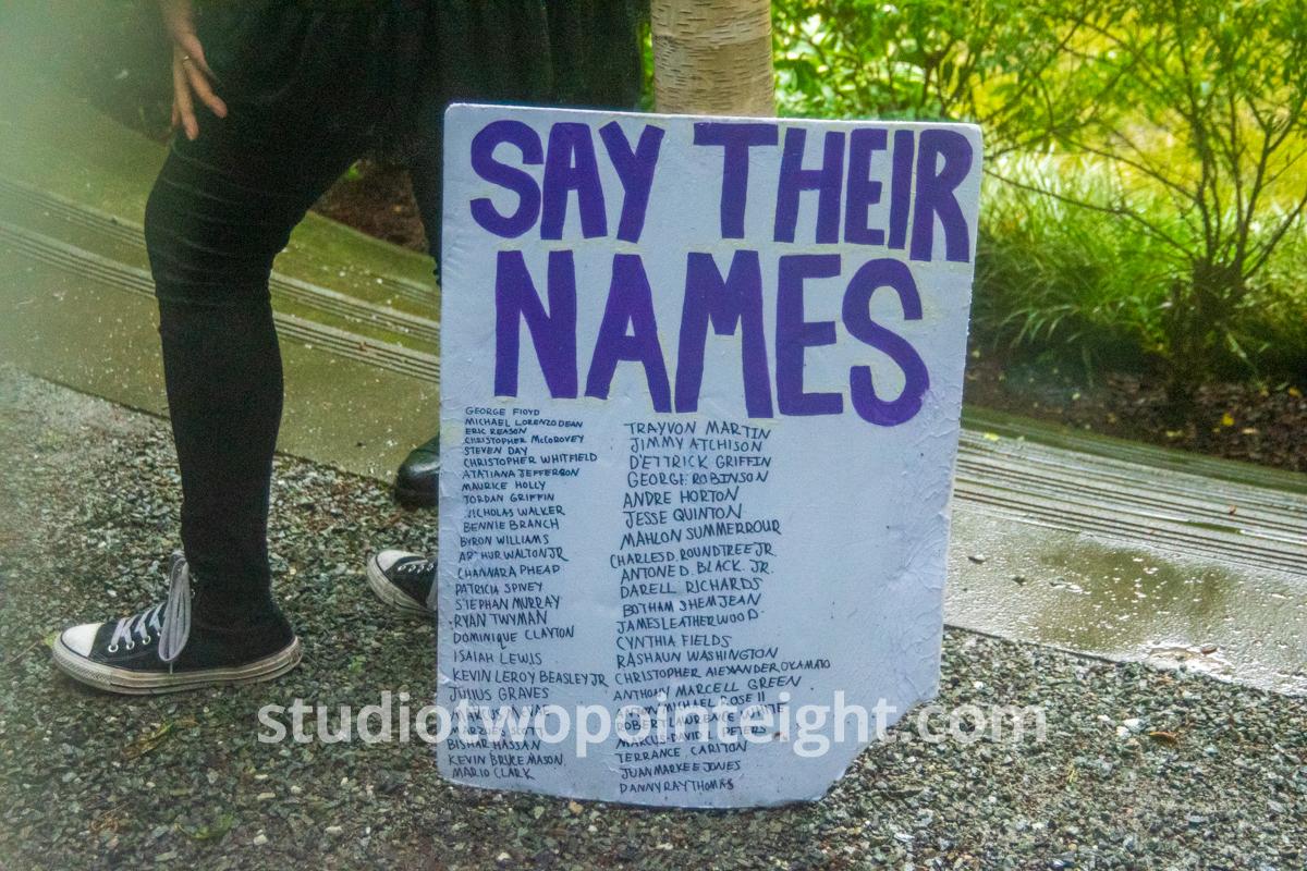 This Studio 2.8 photography photograph of a racial justice demonstrator with a poster leaning against her leg that contained the headline "Say their Names", and the list of the names of African American people killed by police, downtown Seattle, Washington on the courtyard in front of the federal courthouse near 7th Avenue and Stewart Street during the late afternoon of Saturday May 30 2020.